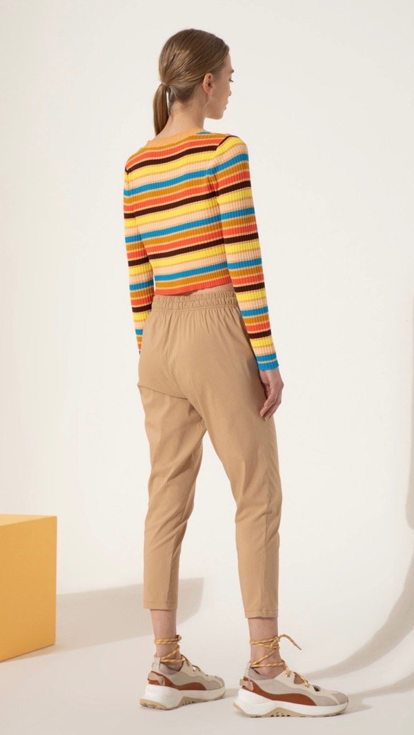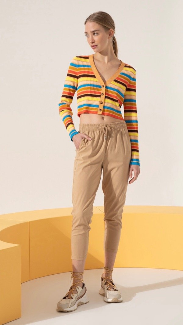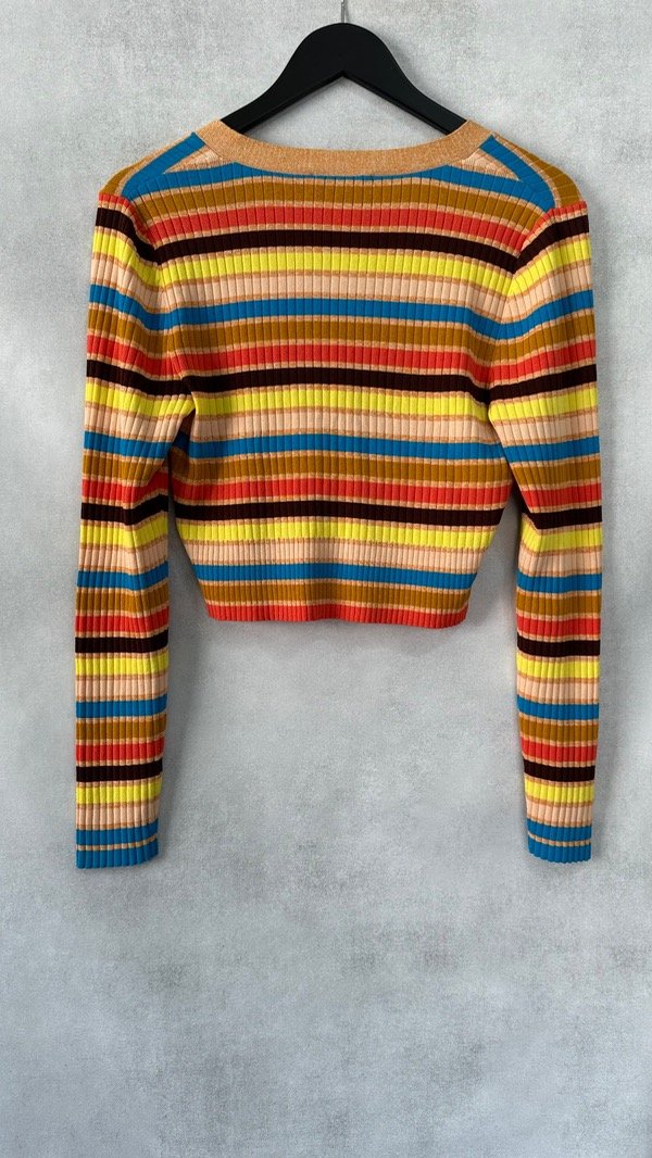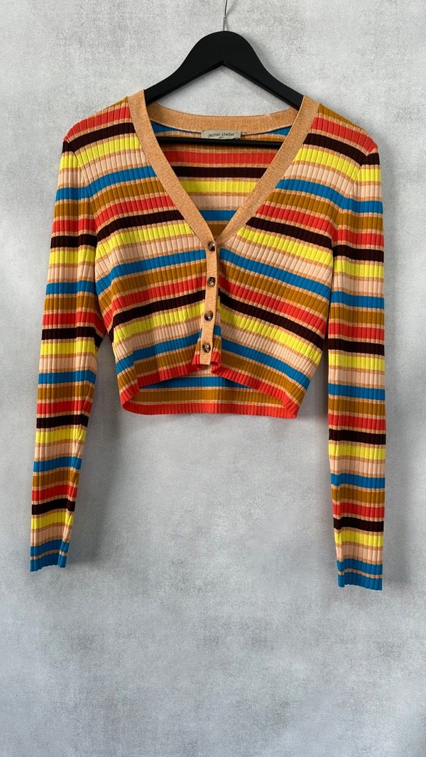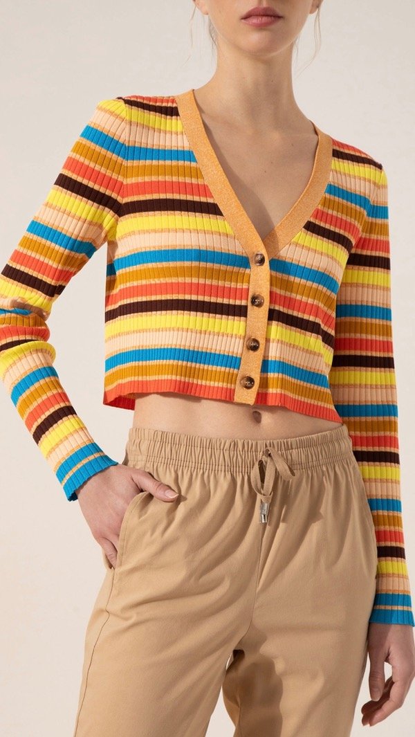 Cardigan tejido en hilado de tacto frío y elástico. De punto ribb ancho y rayado multicolor con intervalos melange que complementan el diseño a rayas. Fit entallado y corto, con mangas largas y escote en «V». Acceso mediante botones en el frente.