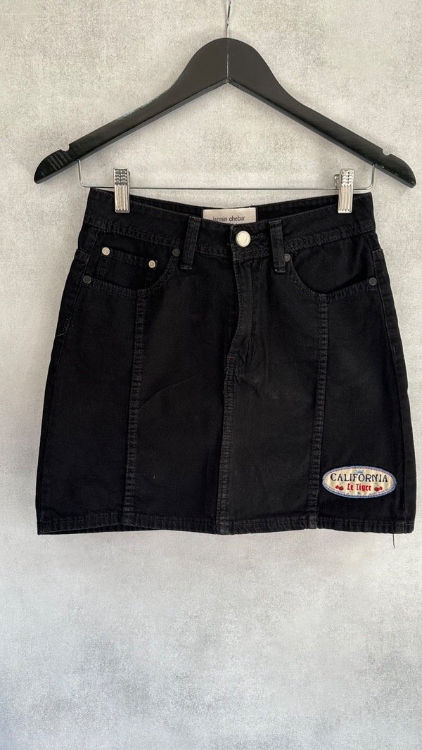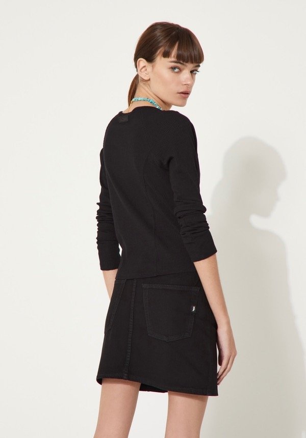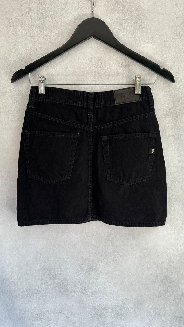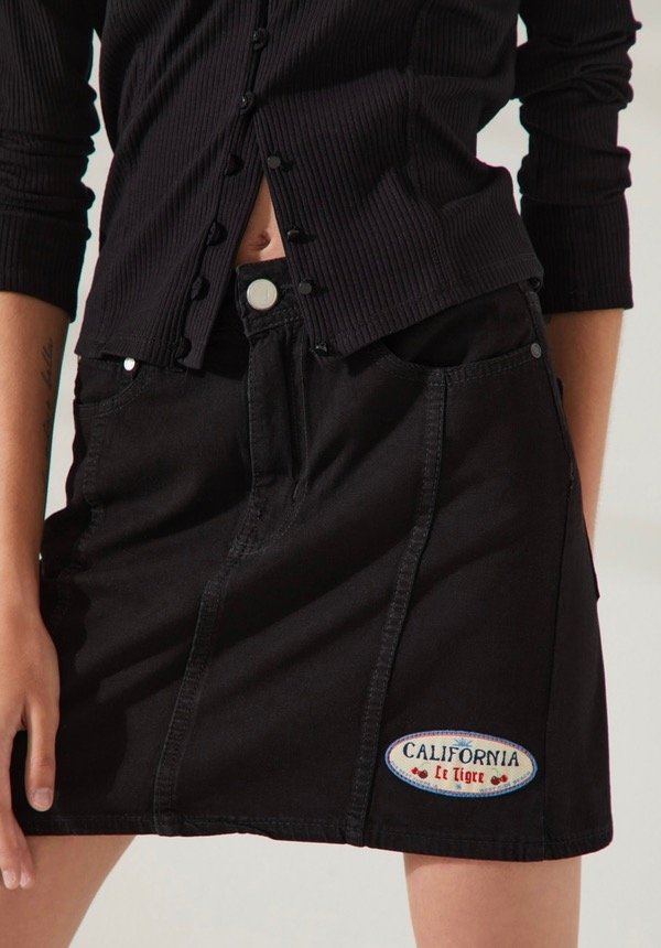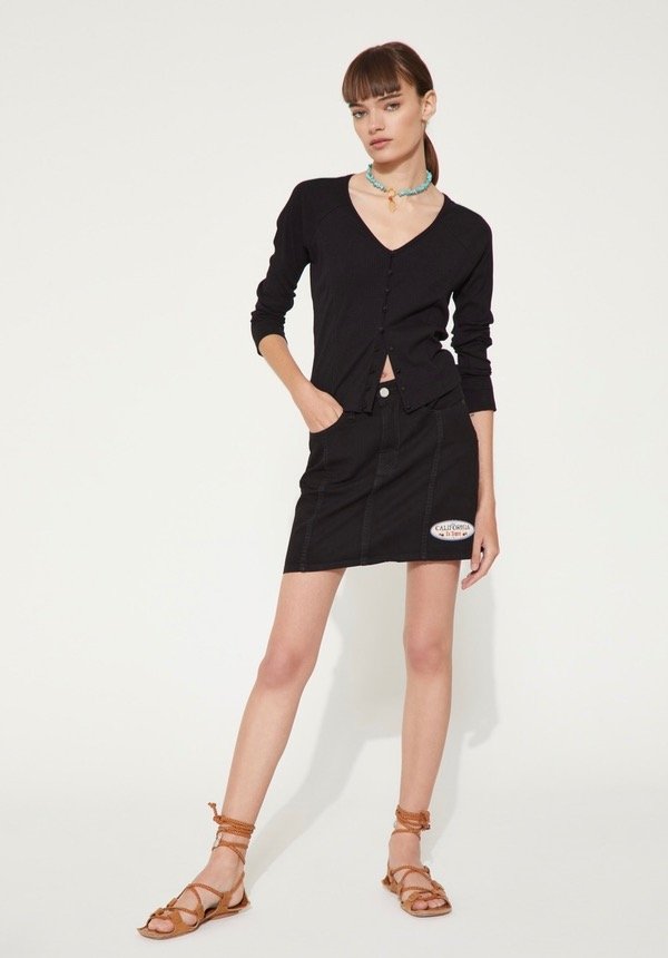 Mini denim negro súper liviano, 100% algodón. Tiene recortes verticales a los lados y viene sobreteñida de negro para que sea aún más intenso.