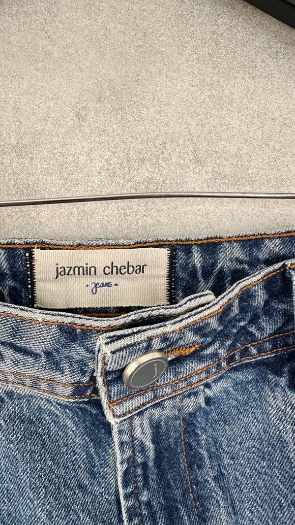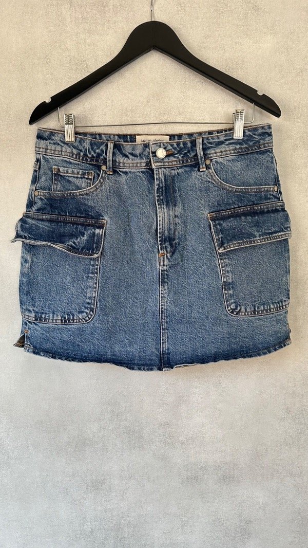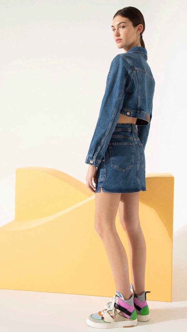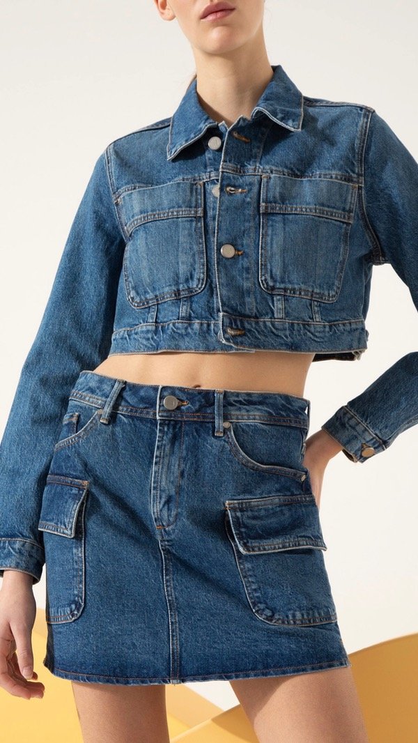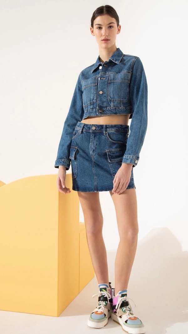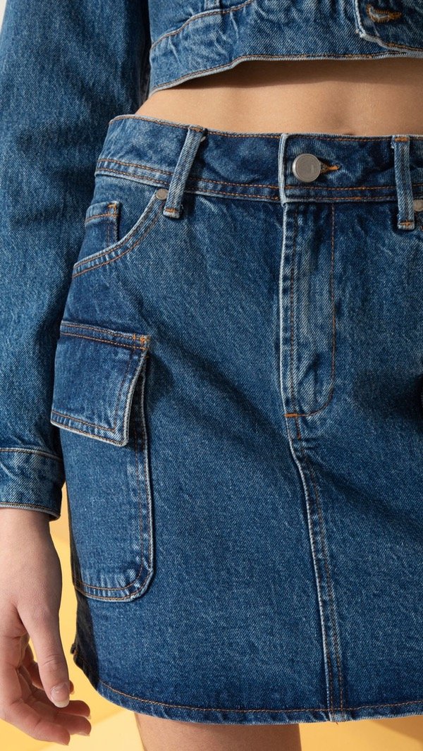 Mini de tiro medio-bajo en un denim apenas confort. El lavado es medio y plano sin contrastes; viene con bolsillos con tapa tipo cargo en los laterales y un tajo chiquito en los costados.