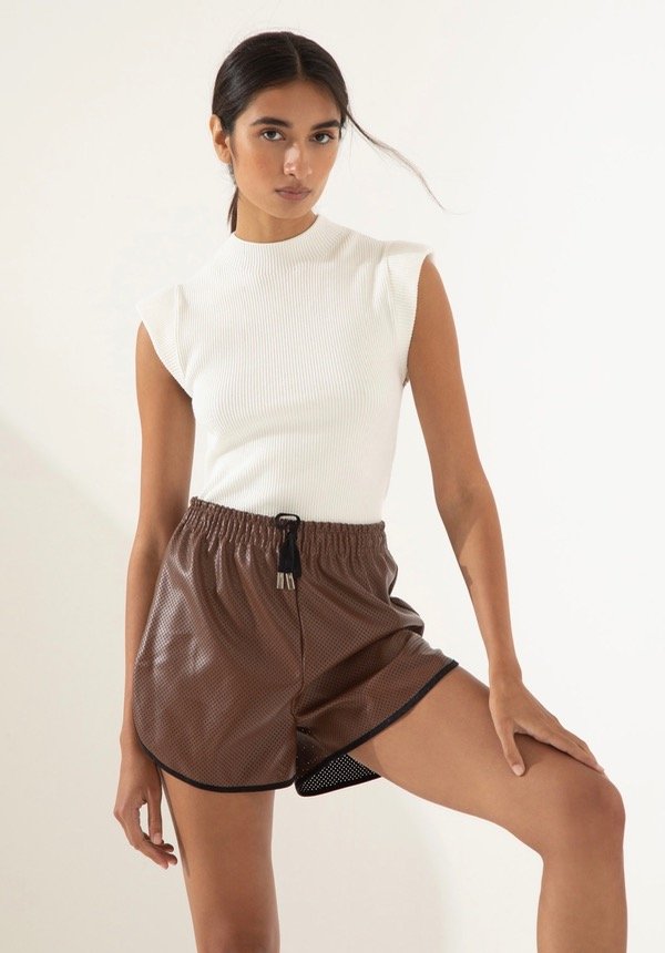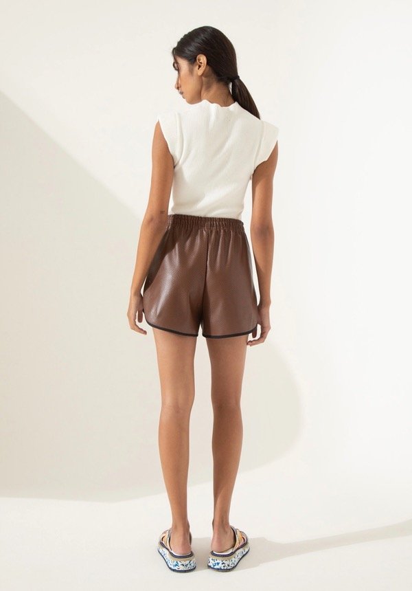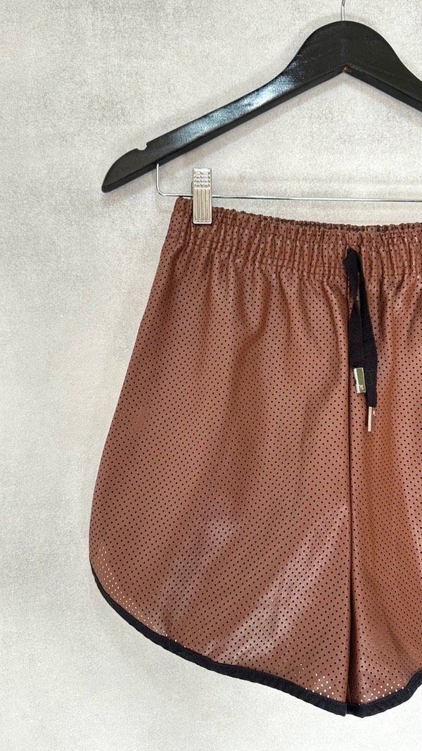 Short confeccionado en cuero ecológico calado. Fit suelto, con cintura con elástico interno y ajuste con cinta para regular su calce. Detalle de ruedos laterales curvos.