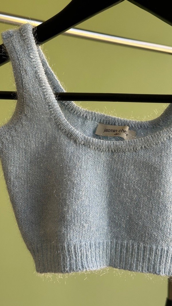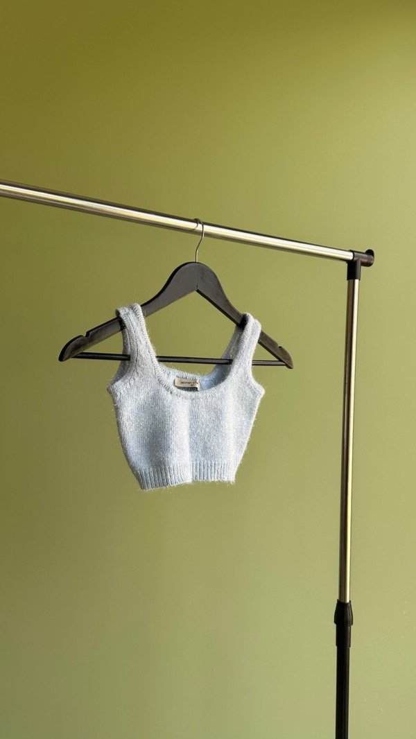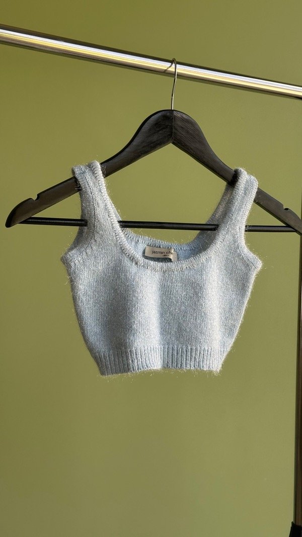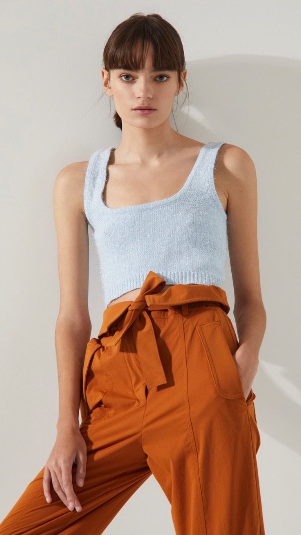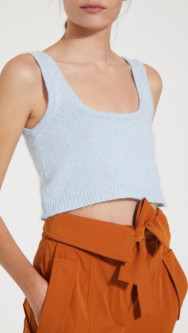 Crop Top tejido en hilado de grosor medio, con fecto de pelo cristal y brillante. Escote en "U" bajo. Fit entallado, ideal para completar el twin set con el Cárdigan Julia y un pantalón de tiro alto.