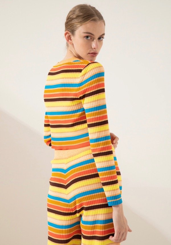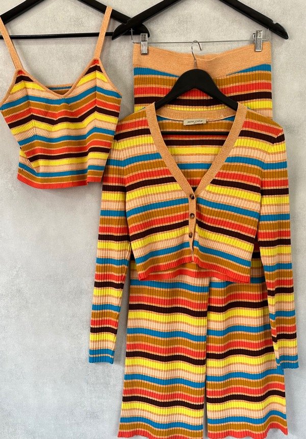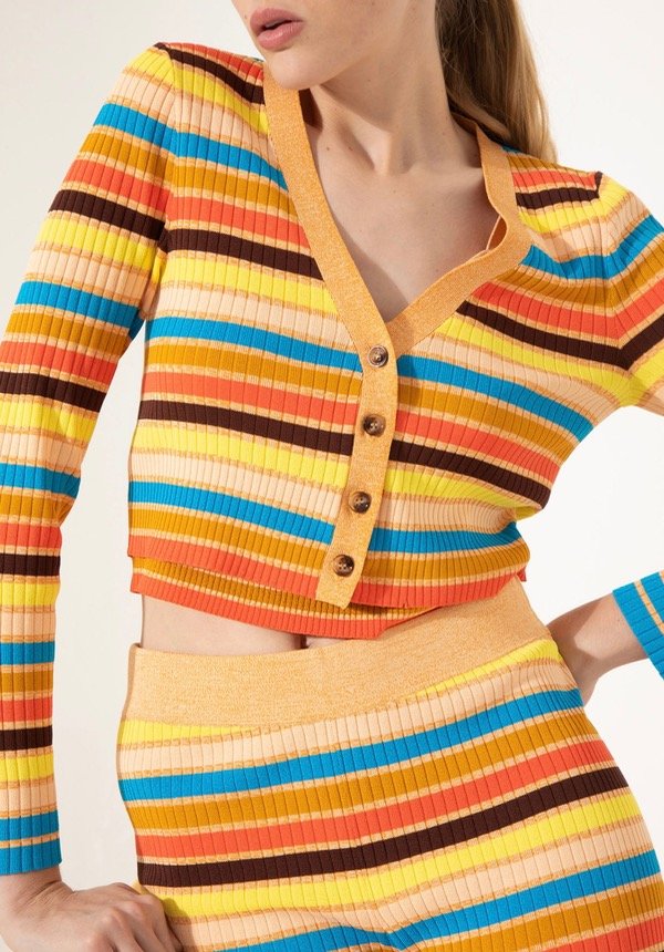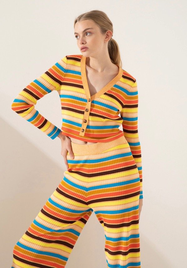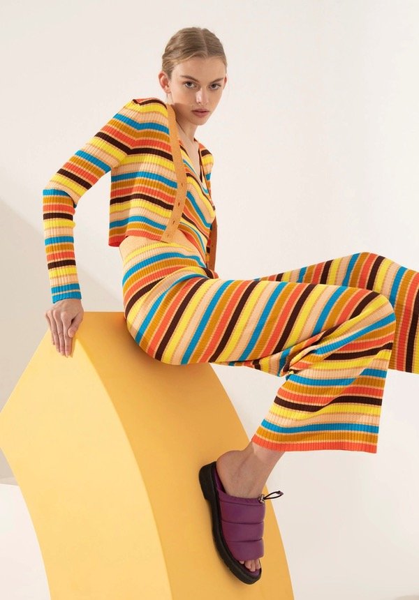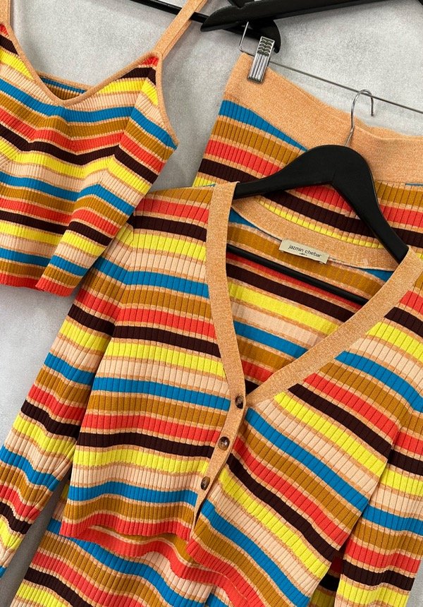 Conjunto tejido en hilado de tacto frío y elástico. De punto ribb ancho y rayado multicolor con intervalos melange que complementan el diseño a rayas.