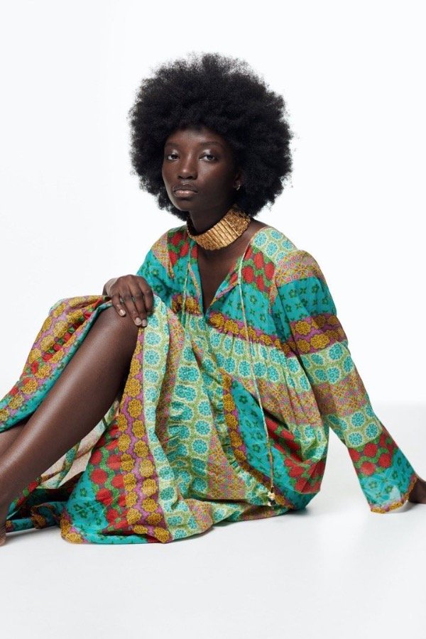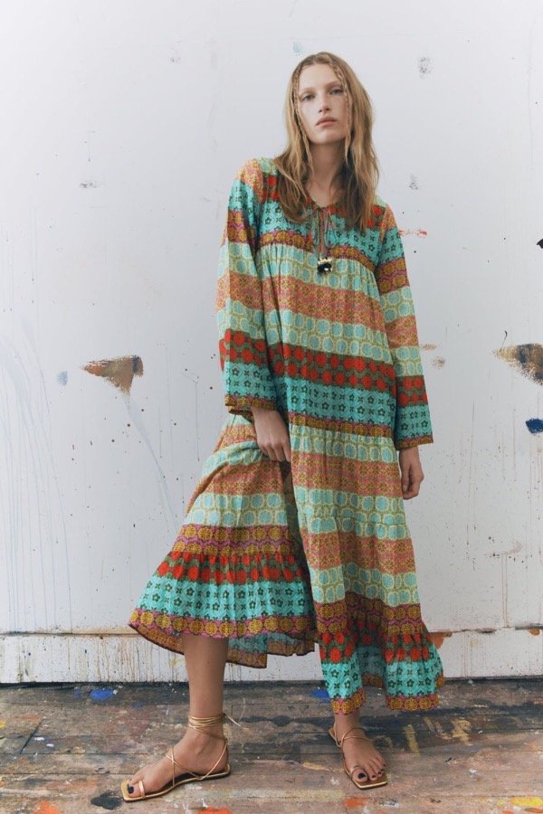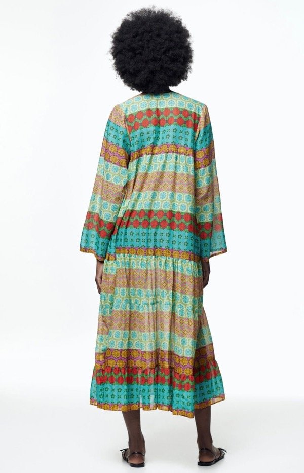 Vestido largo en tejido ligero, tipo túnica, con estampado geométrico multicolor en cenefas. Este diseño tiene silueta amplia, cuello redondo con abertura y cierre mediante cordones decorados con cuentas y, manga larga. La falda está dividida en paneles y el bajo acaba en volante.
