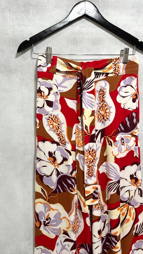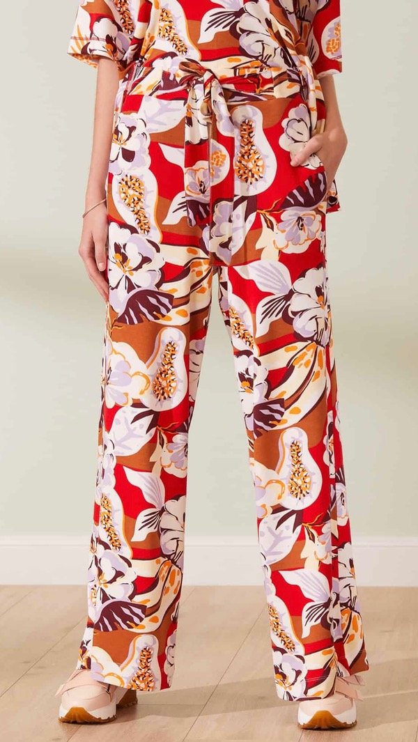 Pantalón de rustico con un motivo de flores tropicales, tiro alto y pata ancha. Con cintura elastizada, fruncida en la espalda y lazo en el delantero.