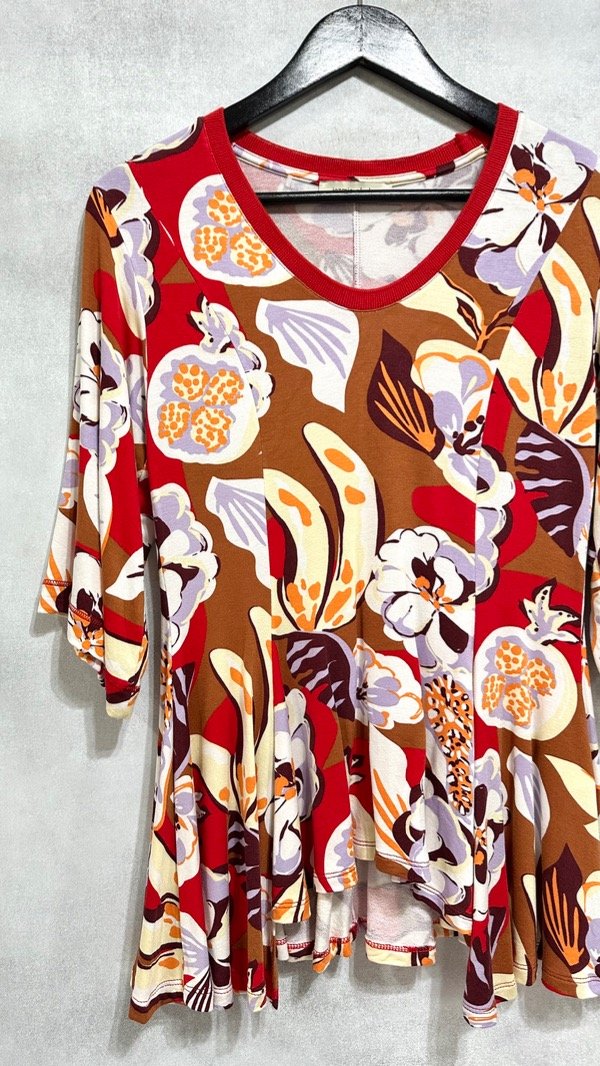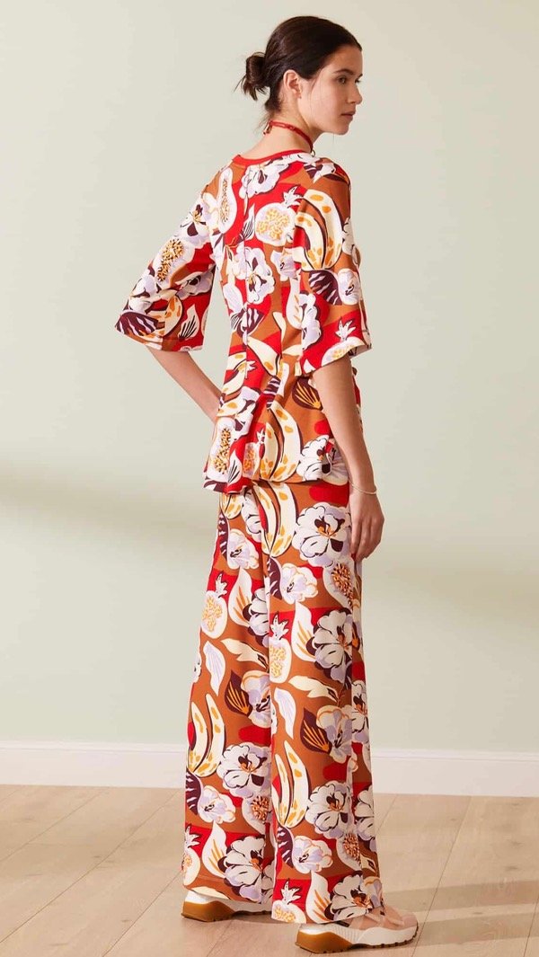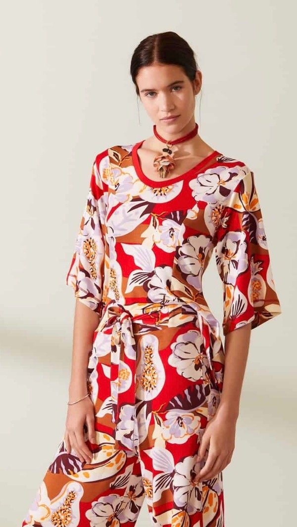 Remera estampada con un motivo de flores tropicales multicolor. Fit amplio línea «A» entallado en la cintura. Escote en «V» con manga corta amplia.