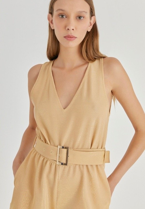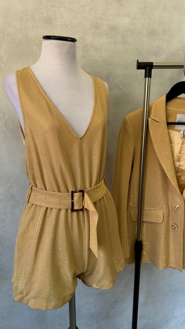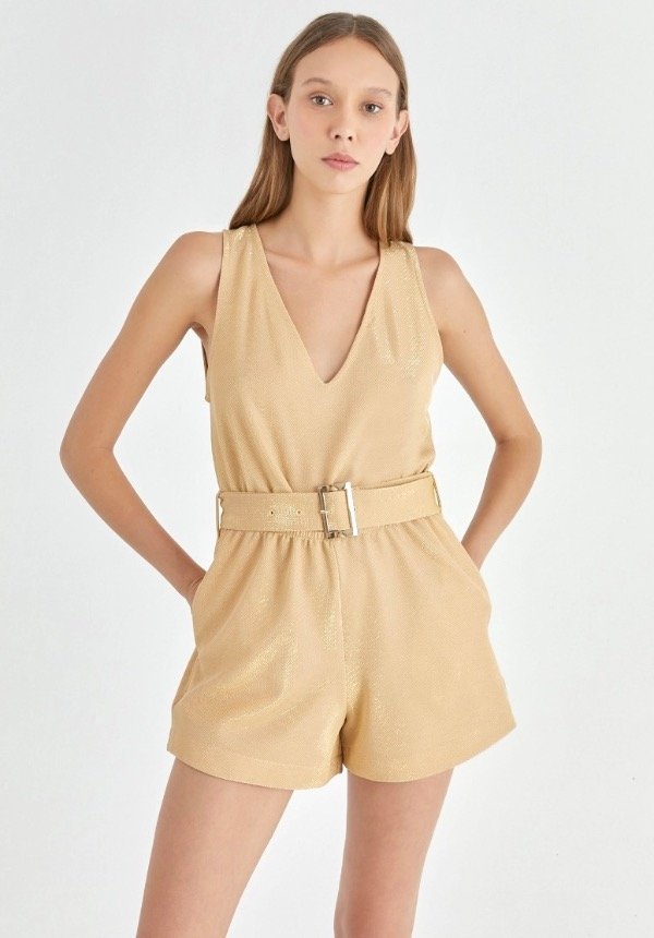 Mono corto confeccionado en tejido panal con lurex de color oro. Escote en V. Trae cinturón con hebilla y bolsillos laterales. Regular fit.