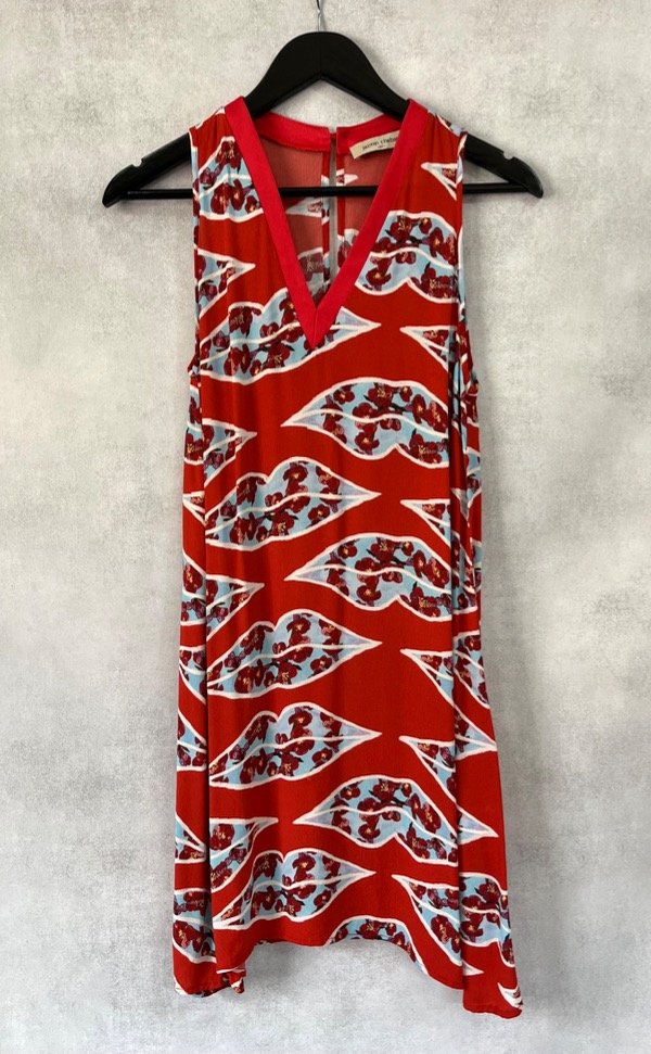 Vestido estampado con silueta en línea "A" que aporta fit confortable. Escote en "V", con recortes en combinación de tejidos. El diseño de estampa Lips es exclusivo de esta colección.