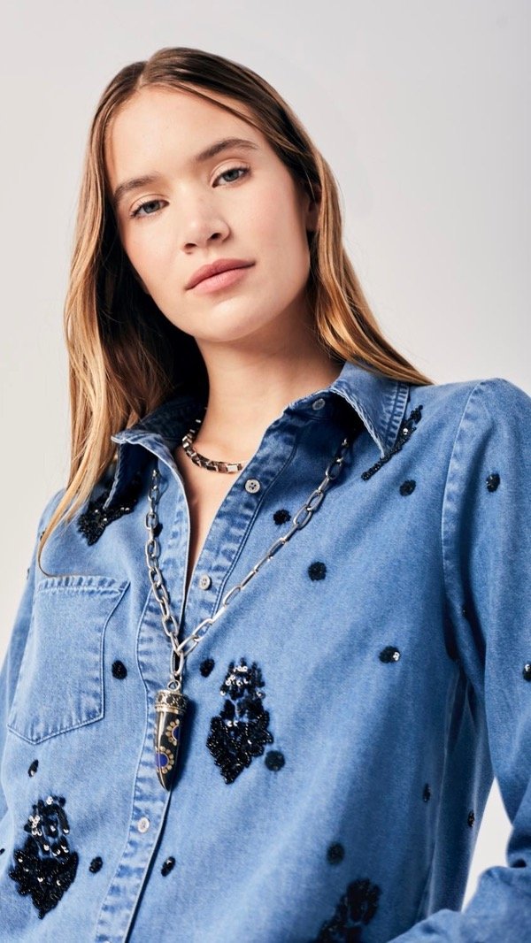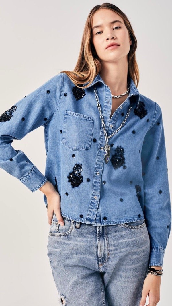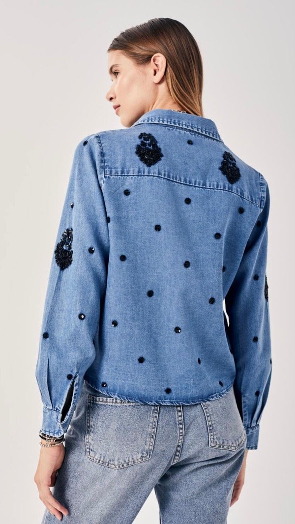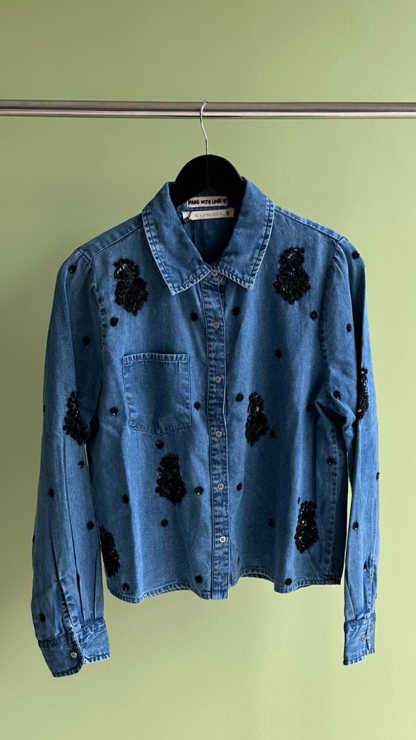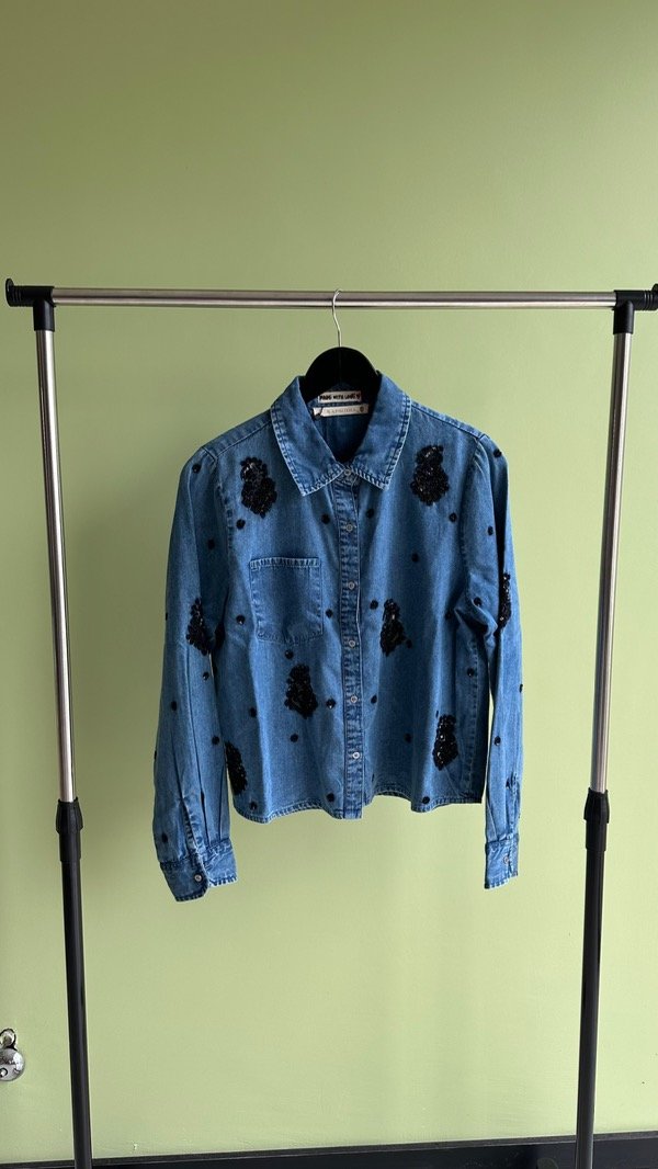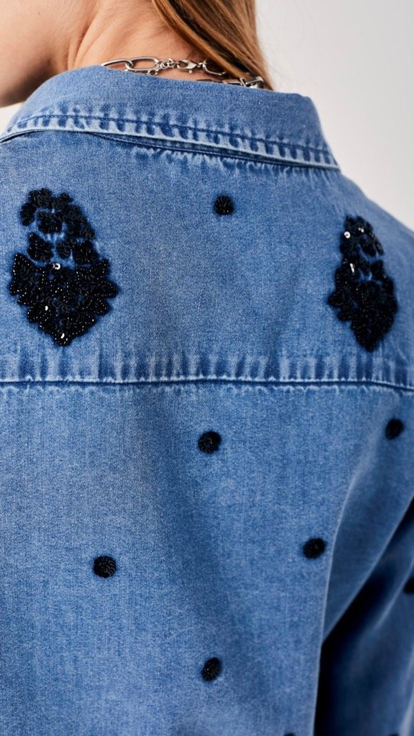 Camisa de tencel con cuello camisero. Manga larga terminada en puño. Detalles bordados con lentejuelas y mostacillas negras a contratono. Bolsillo en el delantero. Cerramiento delantero con botones metalicos.