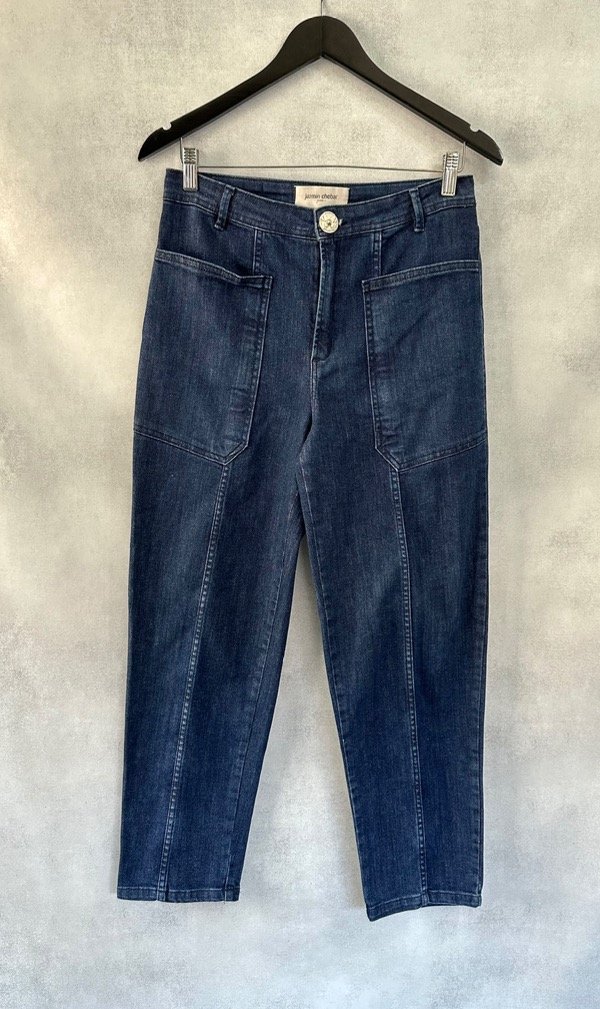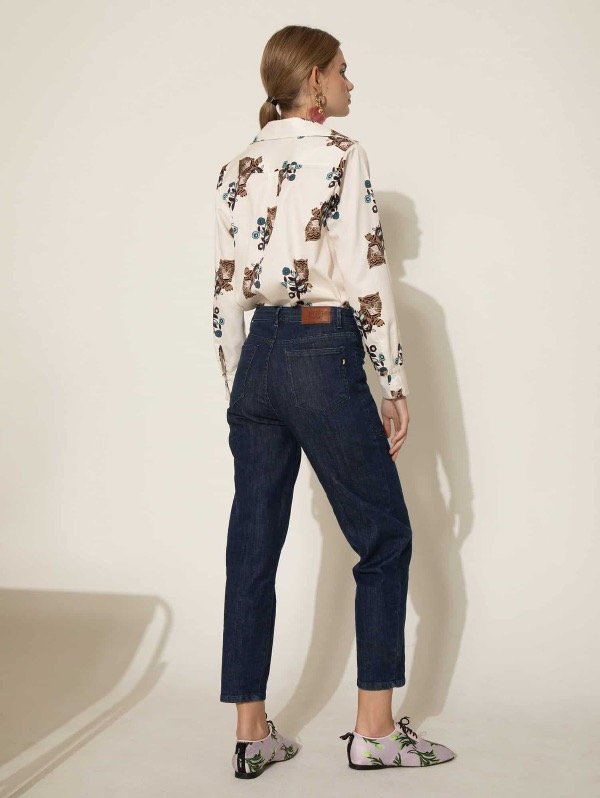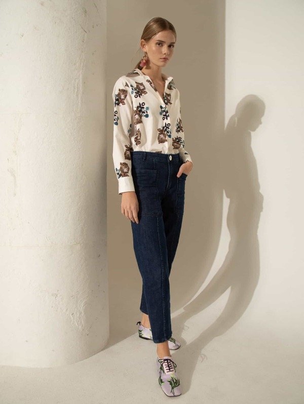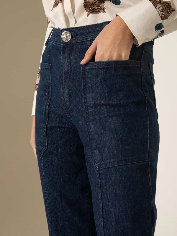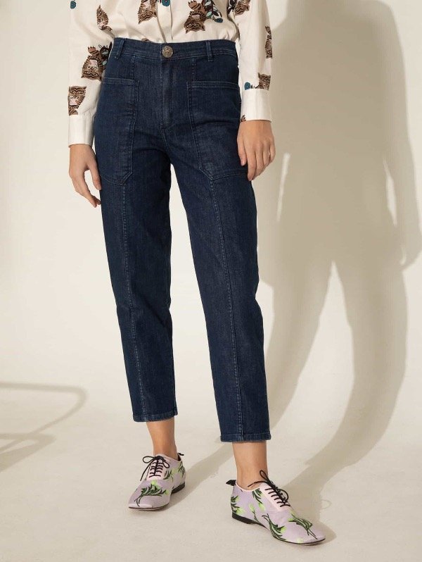 Jeans slouchy de tiro alto confeccionados en tejido de algodón con bajo porcentaje de elastano. Silueta moderna con una nueva propuesta de bolsillos plaqué en el frente.