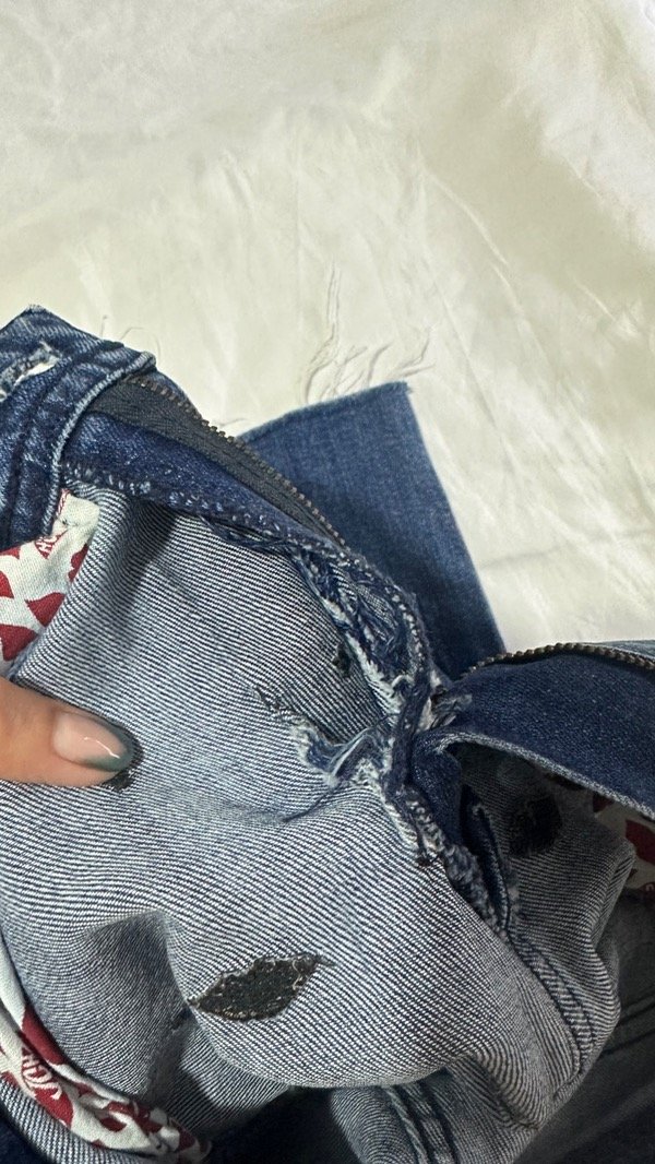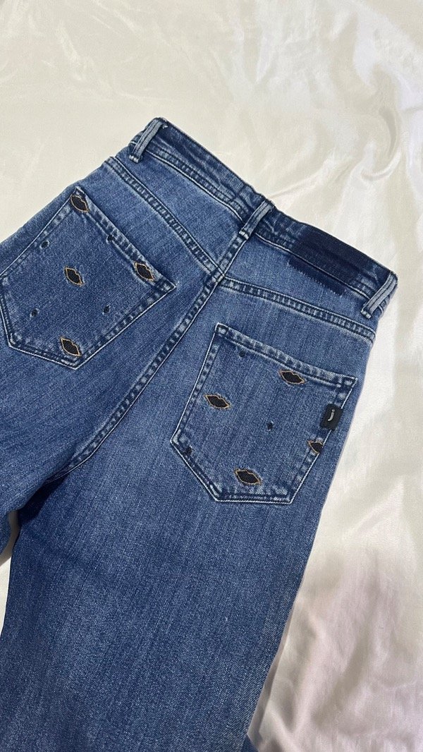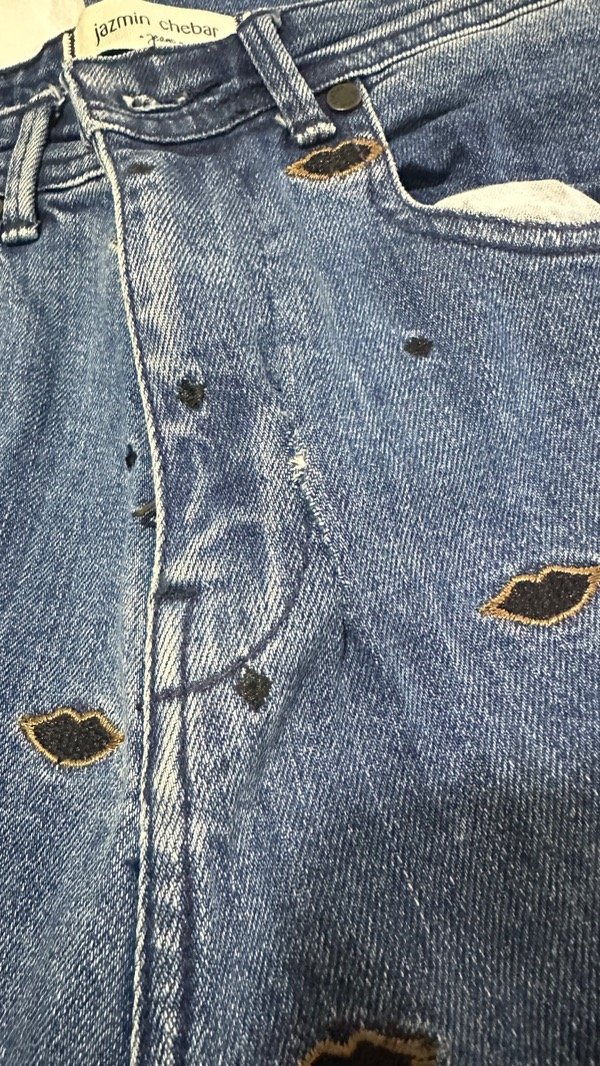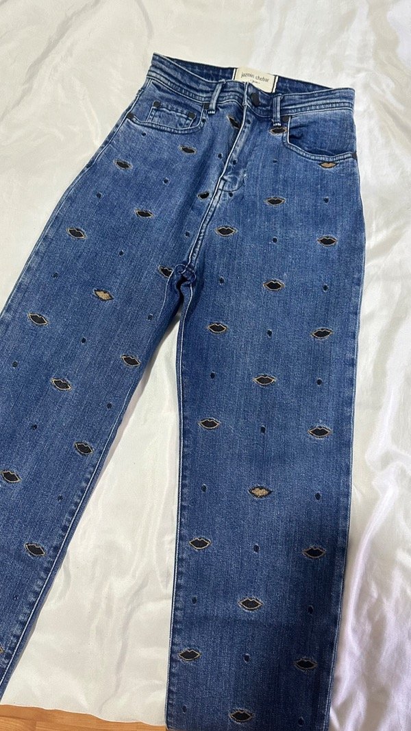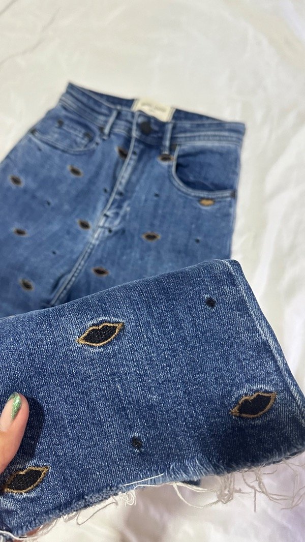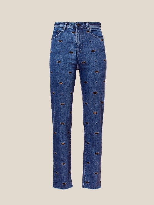 Jeans recto de tono medio y tiro súper alto. El tejido tiene look de rígido pero con un porcentaje de Lycra que garantiza su comodidad. Tiene detalles de bocas bordadas en negro y caramelo, replicando una de las estampas especialmente diseñadas para este verano.