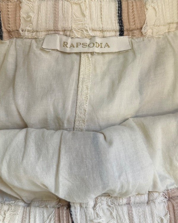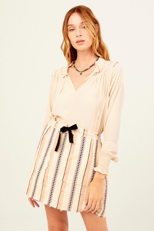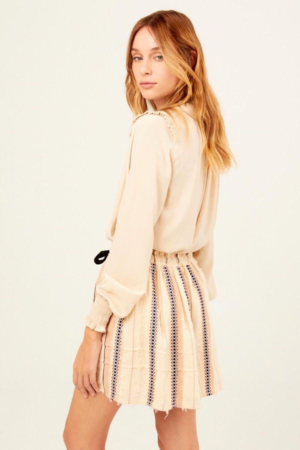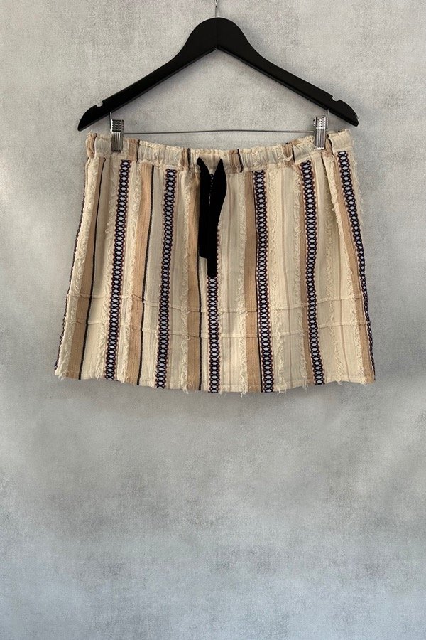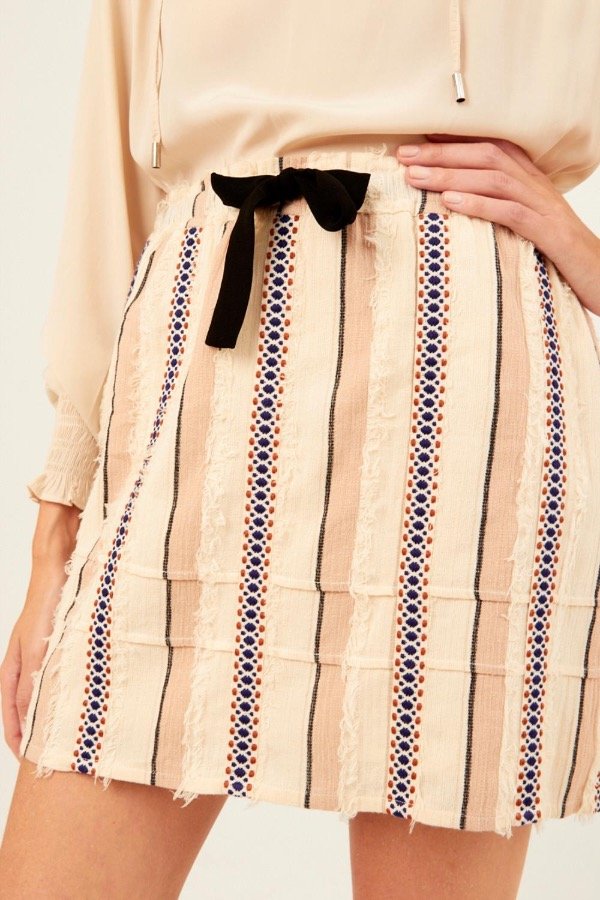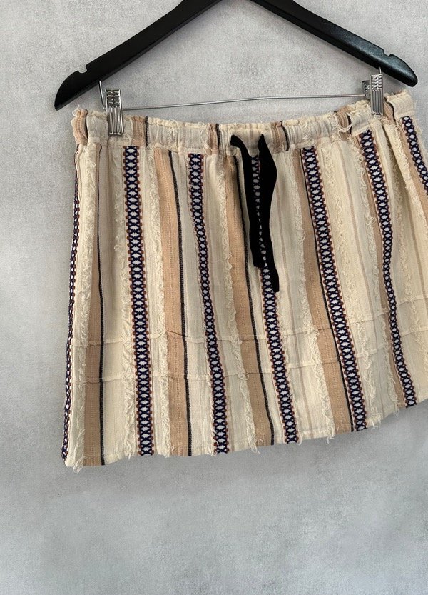 FALDA CORTA CON ELÁSTICO Y CORDÓN EN LA CINTURA PARA AJUSTAR CON APLIQUES VERTICALES BORDADOS