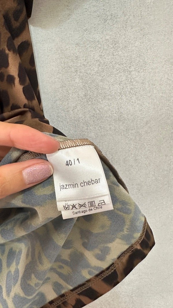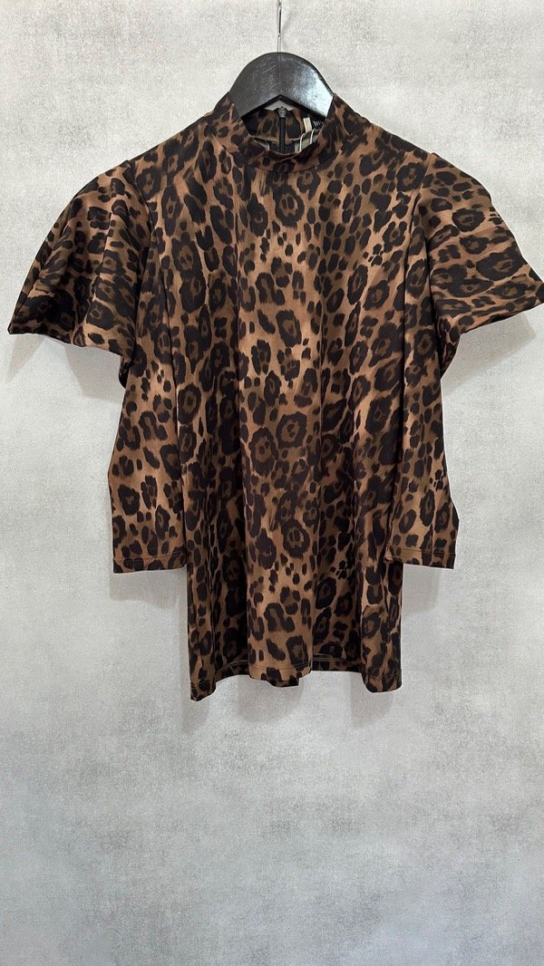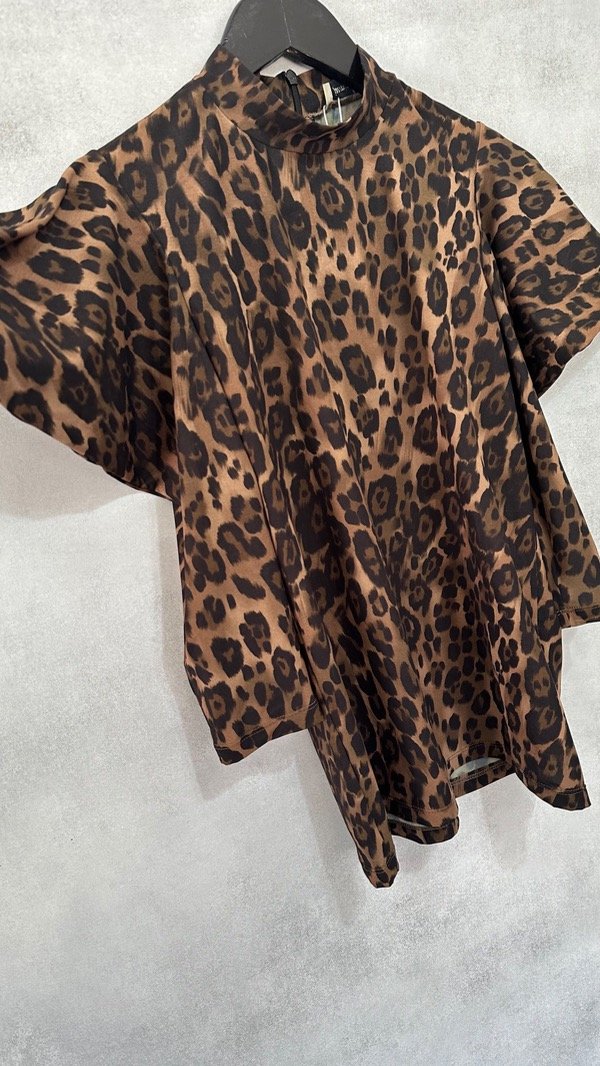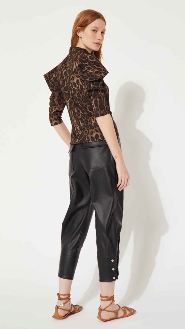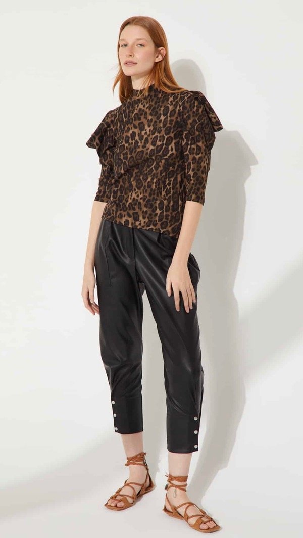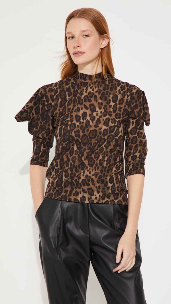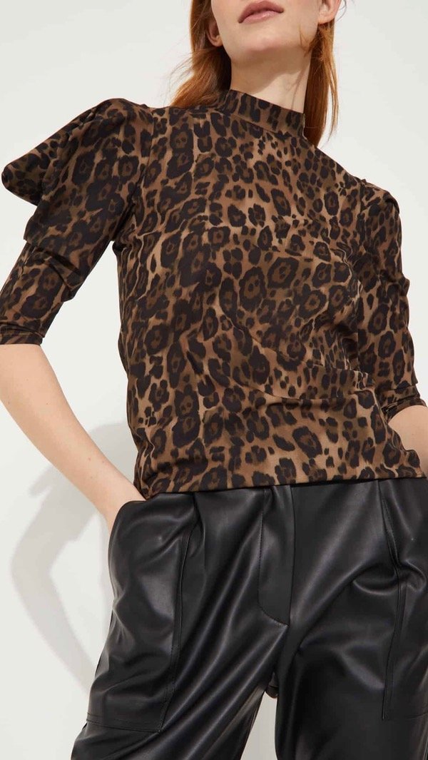 Top corto de fit recto con cuello polera ancho. Presenta pliegue con amplitud en copa de manga 3/4 y puño al cuerpo para generar un volumen que lo hace femenino, joven y especial. Un clásico animal print, un ítem que no puede faltar en tu guardarropas!