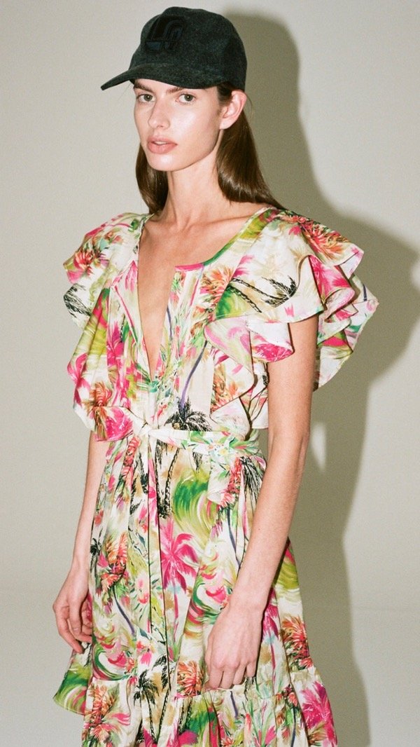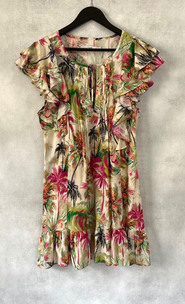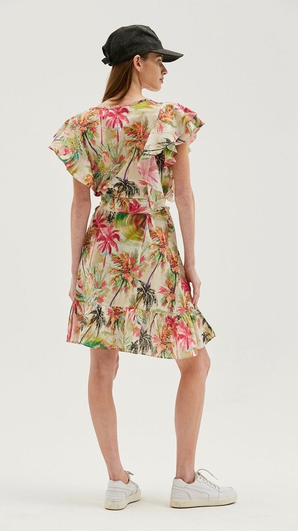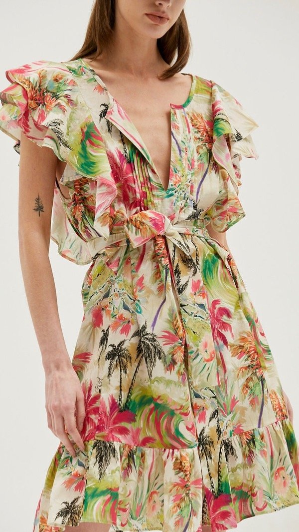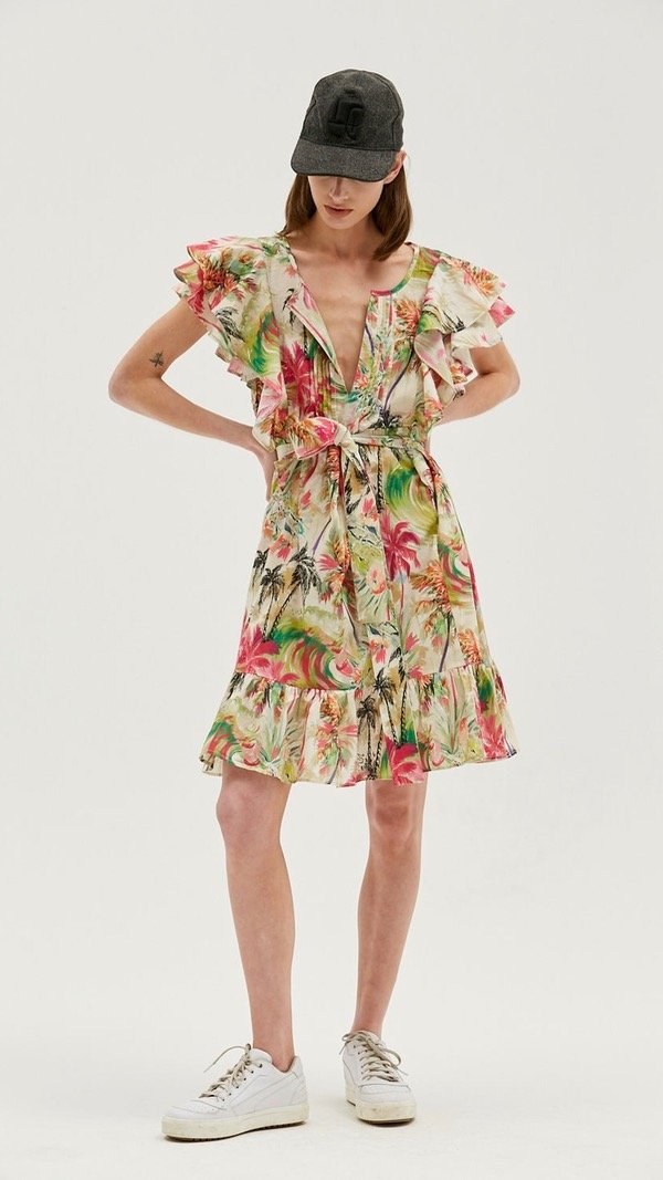 Vestido Corto De Voile Estamapado Sin Mangas. Escote Redondo Con Un Tajo Pequeño En Centro. Detalle De Alforzas Finas A Cada Lado Del Tajo. Tiene Dos Volados Superpuestos Que Continuan De Adelante Hacia Atrás 100% Algodón Lavado A Mano