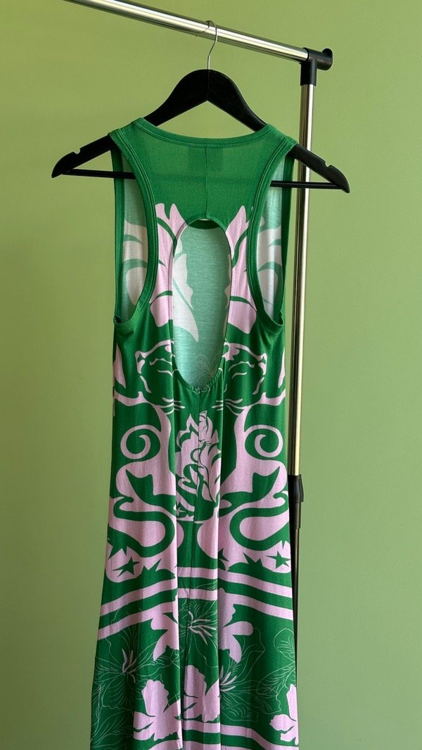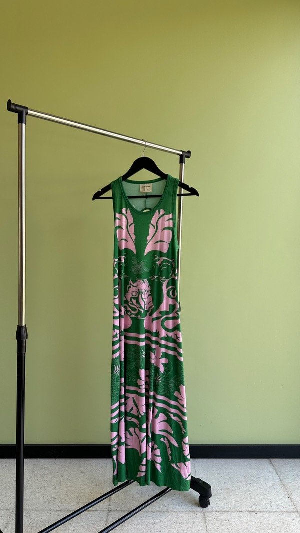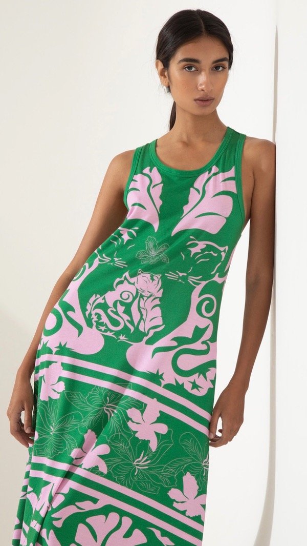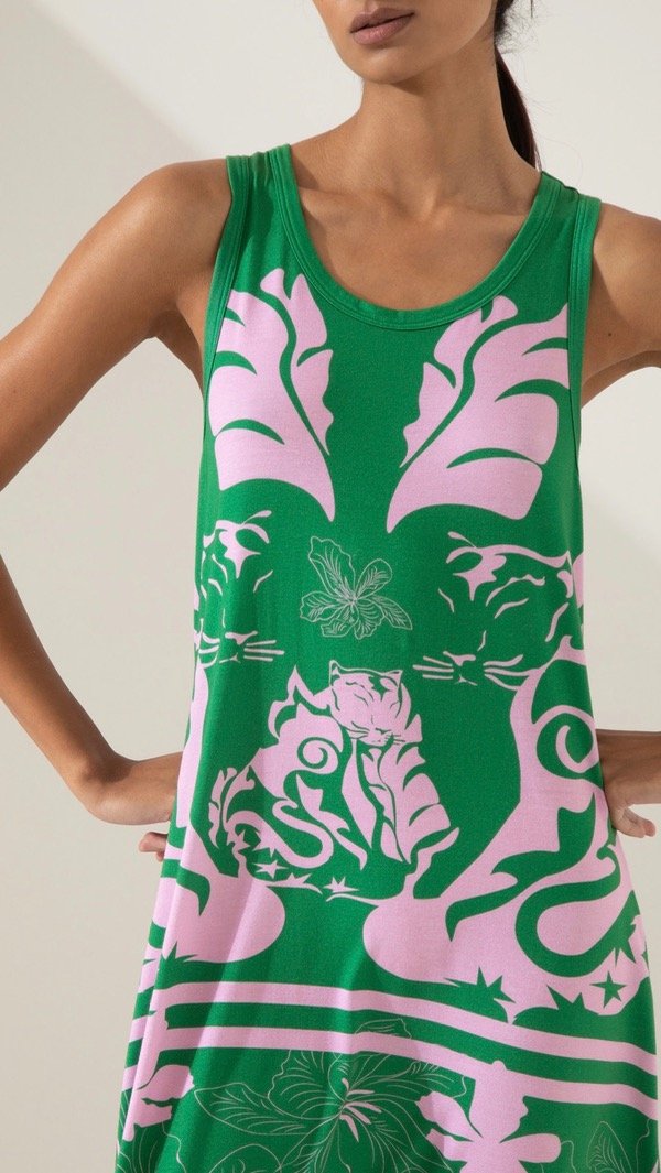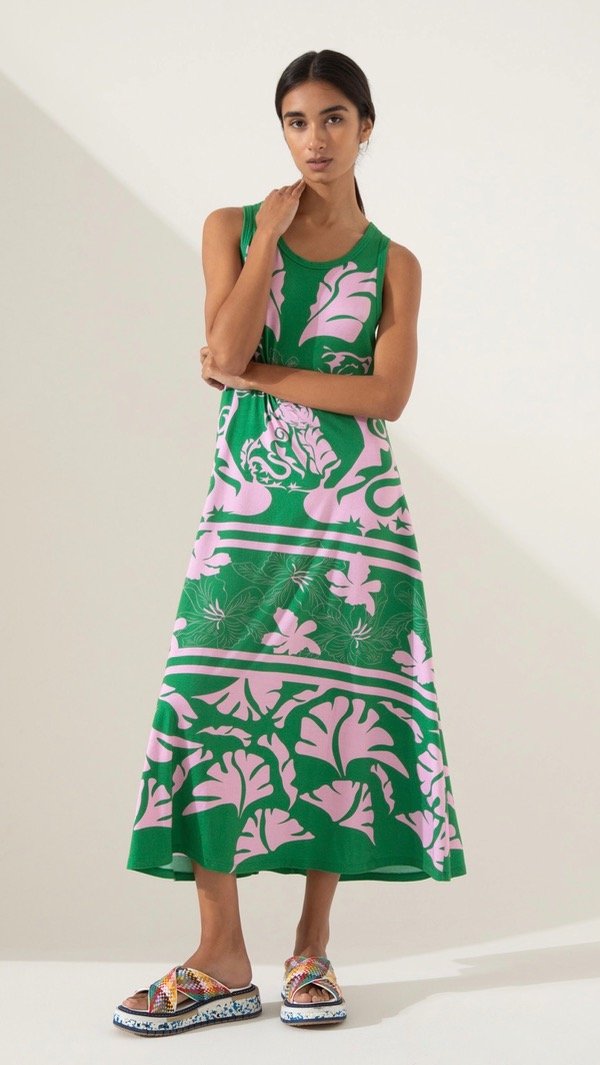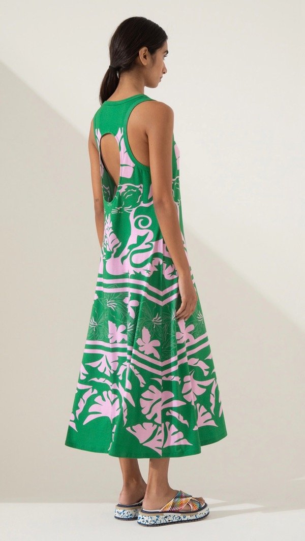 Vestido en jersey con lycra liviano. Fit amplio en linea A, con escote redondo, sin mangas y cutout en espalda. Es un ítem super fresco y canchero para este verano.
