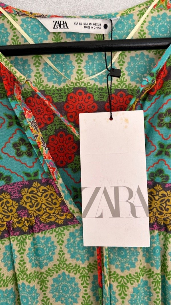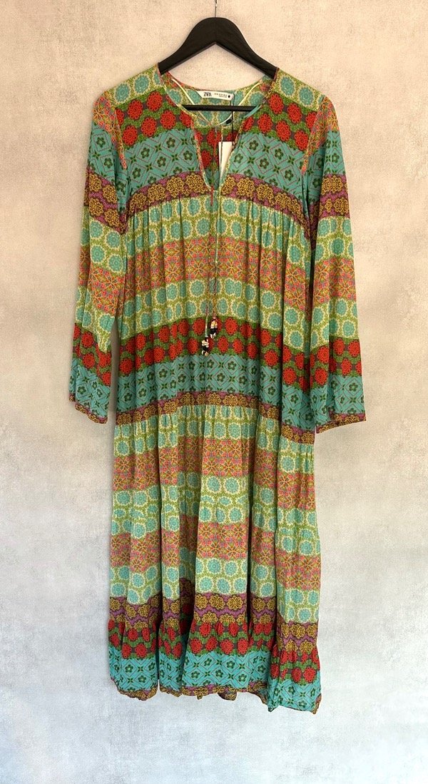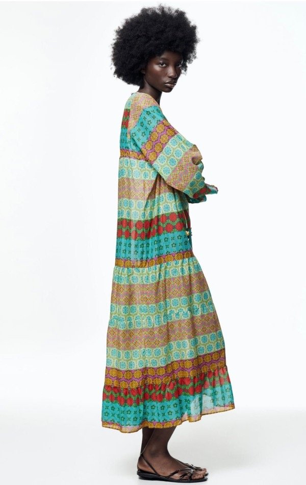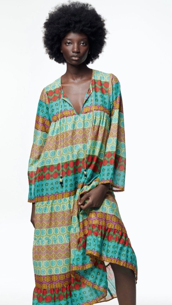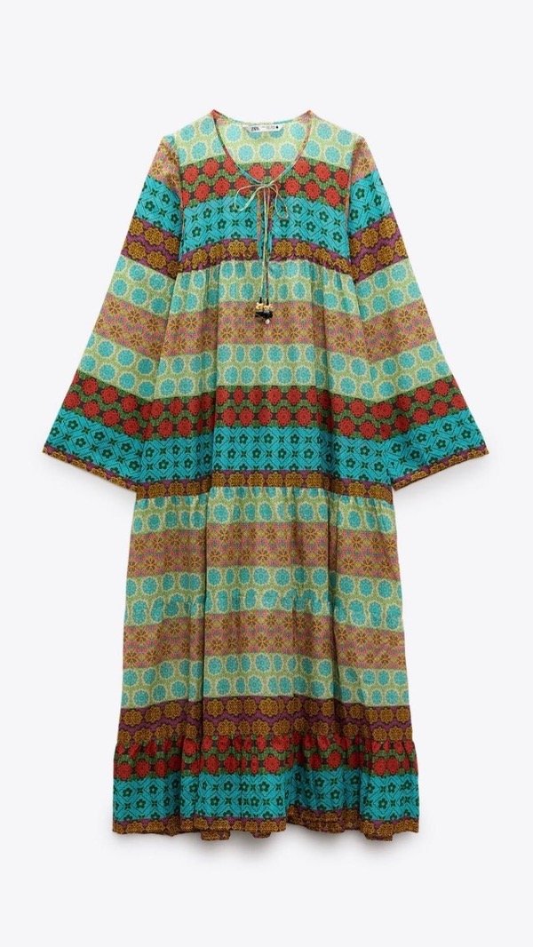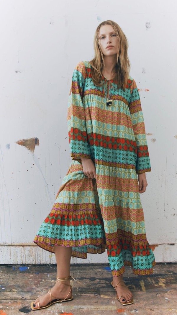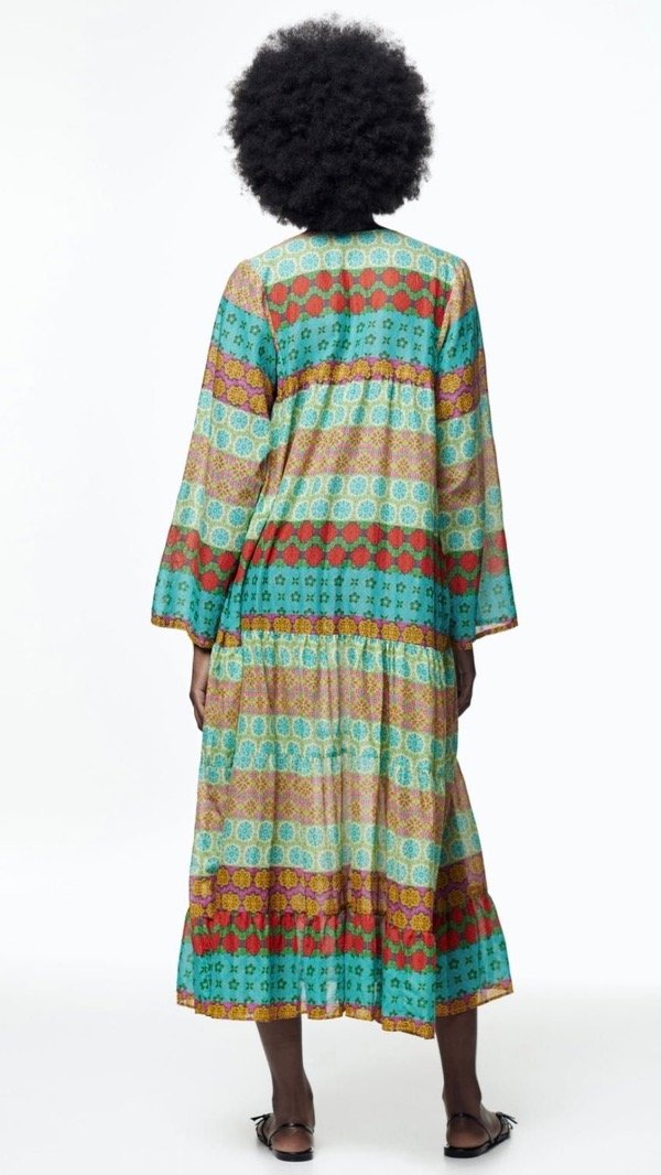 Vestido largo en tejido ligero, tipo túnica, con estampado geométrico multicolor en cenefas. Este diseño tiene silueta amplia, cuello redondo con abertura y cierre mediante cordones decorados con cuentas y, manga larga. La falda está dividida en paneles y el bajo acaba en volante.